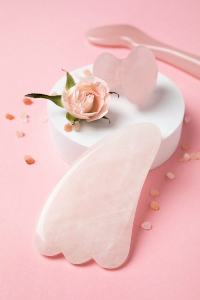 Utilisation d’un Gua Sha en quartz rose, pierre de l’amour et de la douceur.